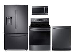 samsung Large Capacity 3-door Refrigerator + Electric Range with Convection + StormWash™ Dishwasher + Microwave in Black Stainless